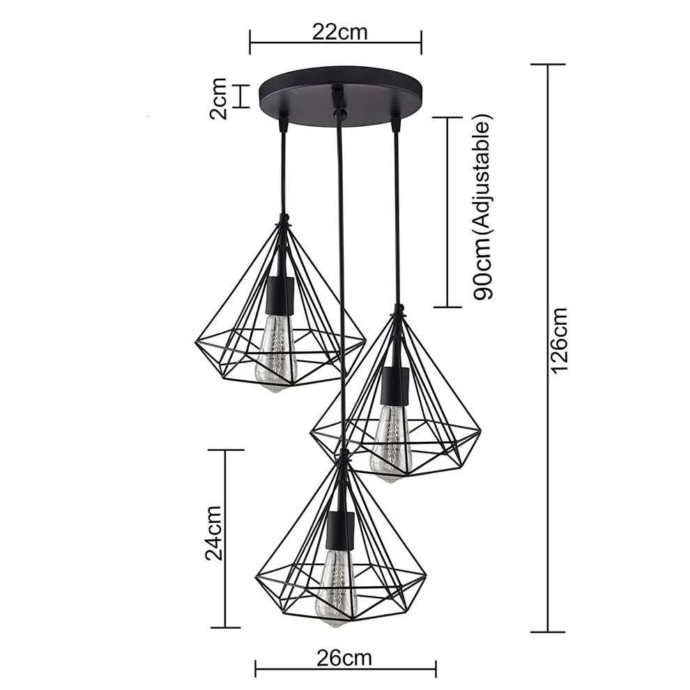 • Illuminate your dining room or living room with this striking cluster pendant features three graduated diamond shaped lights suspended from a round plate on black-finished cords artfully displayed at different heights.